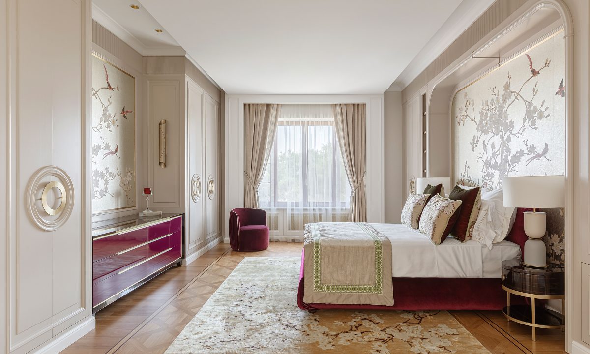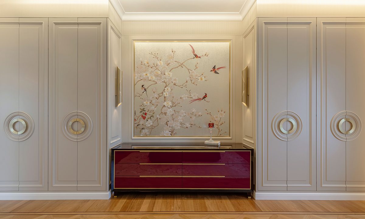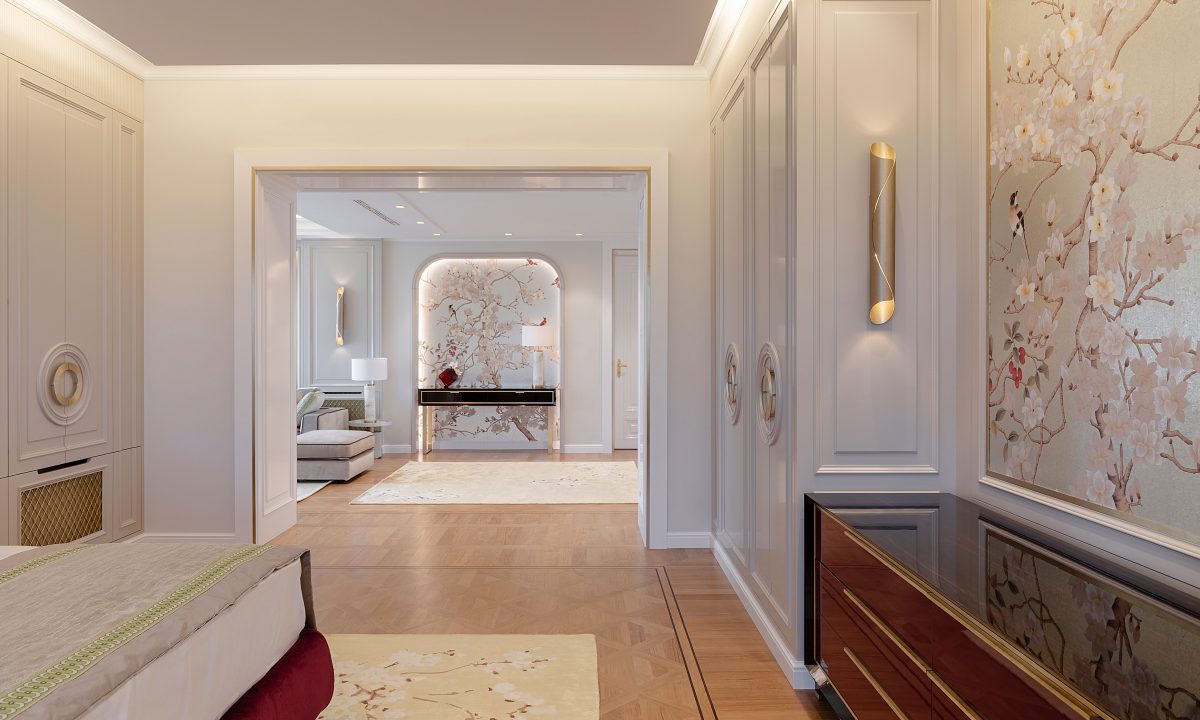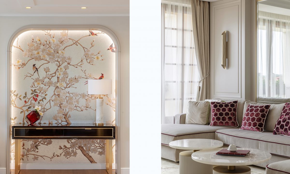 Aceasta amenajare interioara exploreaza echilibrul dintre rafinamentul clasic si confortul contemporan. Paleta cromatica este una neutra cu accente burgundy si detalii de alama, imbogatita cu motive botanice .